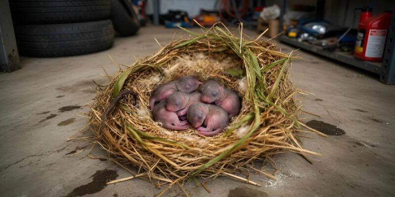 It was quieter than usual. A strange hush had settled over the space, like the garage itself was holding its breath. I instinctively paused, letting my eyes adjust to the dim light filtering through dusty panes. That’s when I noticed it—a small bundle of straw tucked behind an old tire, perfectly shaped and strangely pristine. My heart skipped a beat.