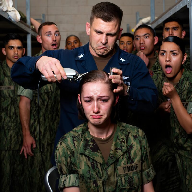 The snip of the scissors shattered the silence, and chestnut strands of hair fell onto the steel floor. In the training hall of the Westport naval base, a hundred recruits stood in rigid formation, the reflections on the metal lockers glinting under the neon lights. Commander Hawk, strict and uncompromising, dominated the room.